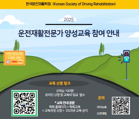 2. 한국운전재활학회 2025년 운전재활전문가 교육과정을 아래와 같이 개최하오니, 많은 참여 바랍니다.가. 본 교육은 장애인 및 고령자의 운전관련 기능 평가와 중재에 대한 강의로 대상자의 사회적 참여와 안전한 교통 환경 조성에 이바지할 수 있는 전문가를 양성하는 교육입니다.